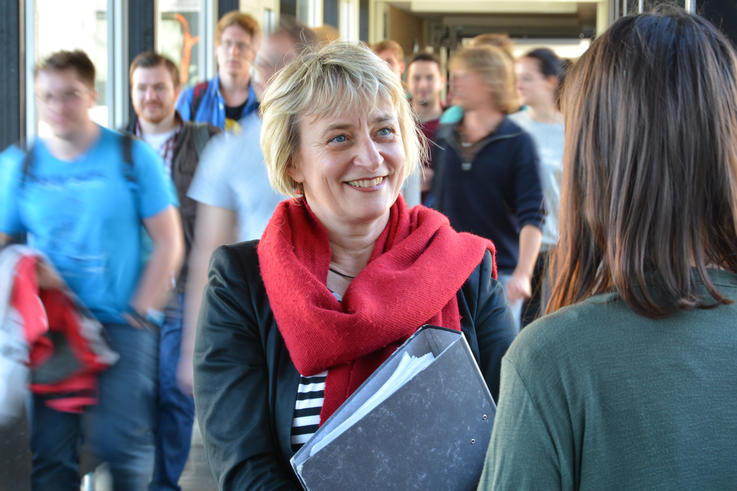 Am Ende ihres Tages schaltet Andrea Menn ihren Computer endlich aus, packt ihre Tasche und verlässt das Büro. Auf dem Flur trifft sie noch einen Studenten, der grade aus dem Ausland wiedergekommen ist. „Es war toll, kann ich nochmal gehen?“ fragt er. Und sie merkt wieder, was sie an ihrer Arbeit liebt.
