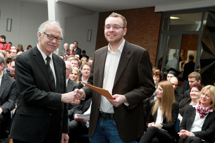 Dr. Gerd Hoffmann (li.) überreichte den Preis des Vereins der Förderer der Fachhochschule Oldenburg e. V. an Johannes Teklenburg (re.). Foto: Piet Meyer